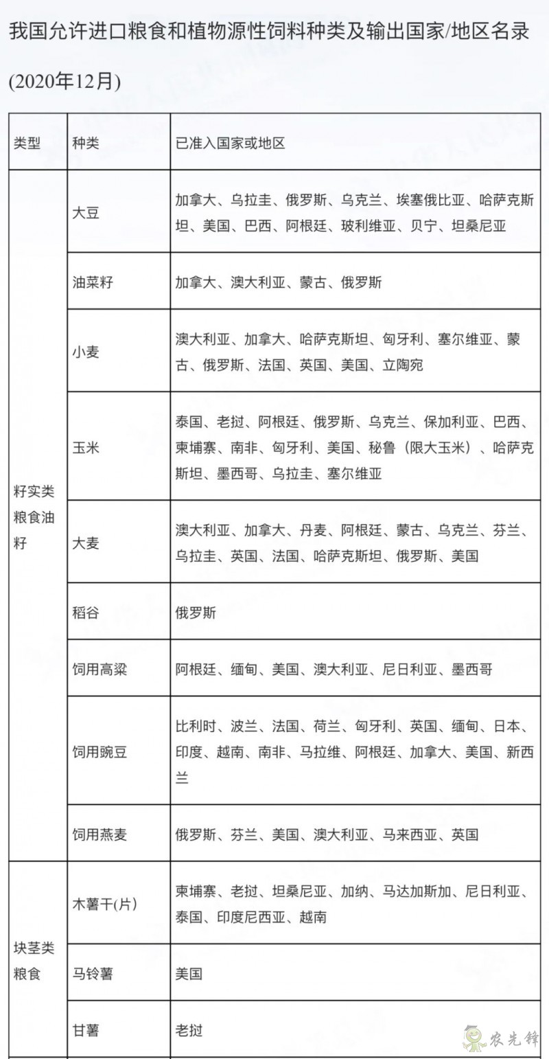 2020年12月30日,海關總署更新了《我國允許進口糧食和植物源性飼料種類及輸出國家/地區(qū)名錄》,詳見以下圖片。