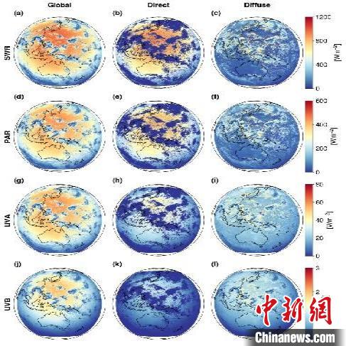 地表太陽輻射組分(短波輻射、光合有效輻射、紫外線A輻射、紫外線B輻射)的總輻射、直射及散射分量的空間分布。中國科學(xué)院空天院 供圖